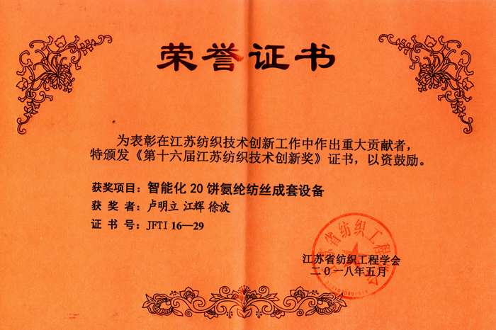● 2018年智能化20饼氨纶纺丝成套设备荣获第十六届江苏纺织技术创新奖